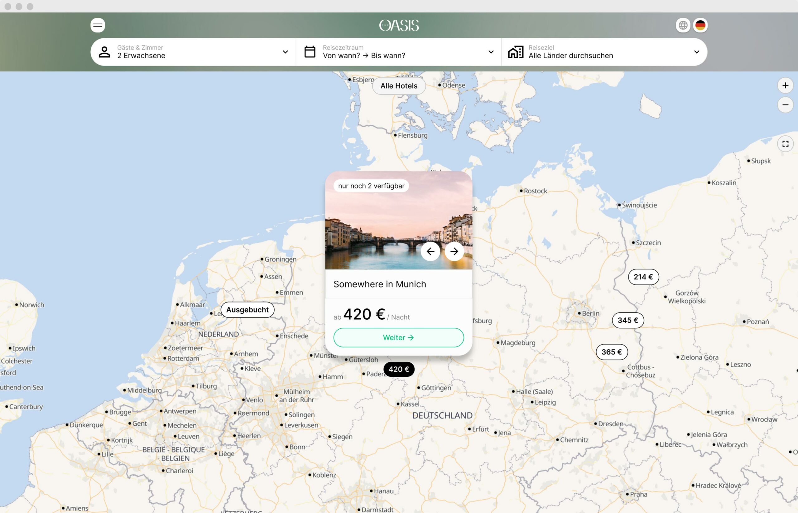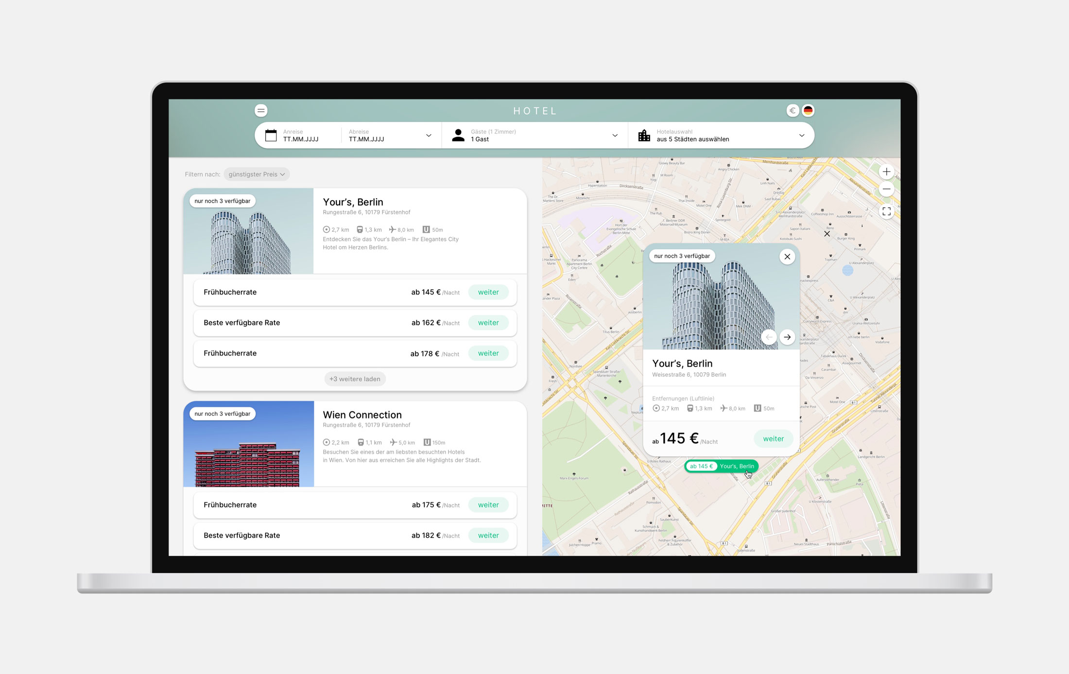 Gäste finden Ihr Hotel nicht nur über die großzügige Karte, sie suchen damit auch. Je nach Ausschnitt zeigt MultiProperty die verfügbaren Hotels in der nebenstehenden Liste an. Ein Klick auf die Bubble und der Steckbrief mit den wichtigsten Informationen zum Hotel erscheint.
